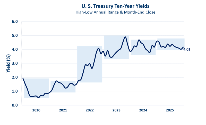 Treasury yields. In general, yields moved lower in 2025, reflecting expectations of a slowing economy due to a weakening job market as well as expectations for continuing Fed funds rates cuts. Fixed income investors have so far dismissed the risk of a tariff-induced reemergence of inflation and Moody’s recent downgrade of the U.S.’s credit rating (following previous downgrades by Standard & Poor’s in 2011 and Fitch in 2023). Although yields moved lower in 2025, they remain relatively attractive and are at the high end of their 15-year range.