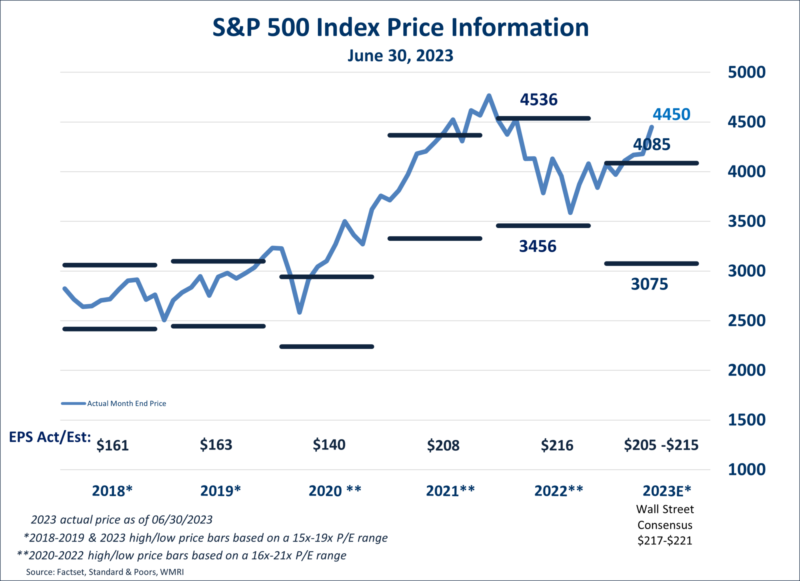Further, inflation pressures continue to moderate, which may allow the Fed to end its tightening cycle. The Consumer Price Index (CPI) rose 3.1% on a year-over-year basis for the period ended June 30, 2023, the lowest level since March 2021. For the same period, “Core” CPI, which excludes volatile food and energy prices, rose 4.9%, still a bit high but trending lower and the lowest level since October 2021. While both CPI measures are above the Fed’s 2% target, expectations are for inflation to continue to moderate. With inflation in check, the Fed may be in a position to pause Fed funds rate increases—and potentially move to a more accommodative monetary policy position, which would be viewed as a positive for both the economy and financial markets.
