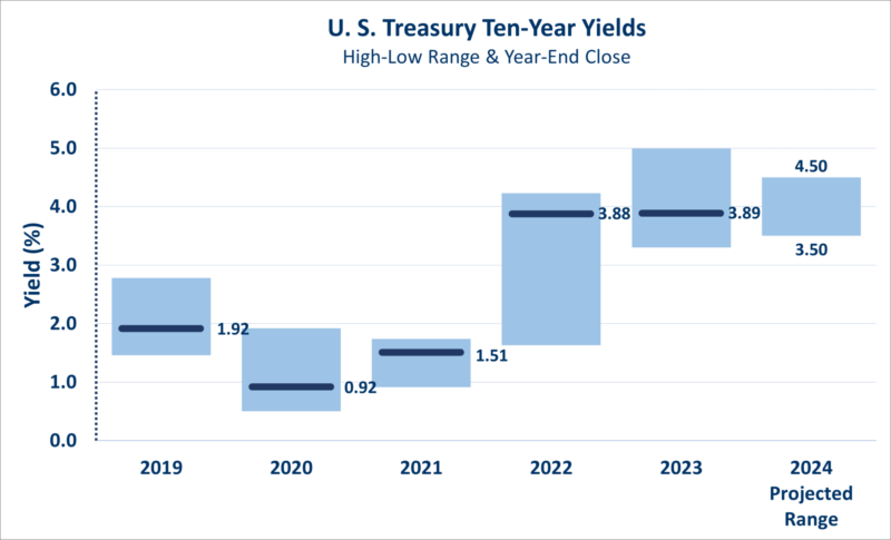 We continue to see opportunity to add duration to fixed income portfolios but continue with a preference for high quality. With yields still in the higher-end of their 15-year ranges and the Fed embarking on an easing cycle in 2024 and 2025, it may make sense to add duration to portfolios. Credit spreads are extremely tight and do not appear to adequately compensate investors for the added credit risk; as such, it may be too early to add exposure to lower-quality corporate bonds and other higher-risk, credit-sensitive segments of the fixed income market. Current high money market yields are likely to fall, and potentially rapidly, as the Fed lowers the fed funds rate.
